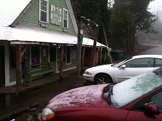 Rest day. It looks like we won't be biking anywhere today. The best-laid plans of mice and men often go awry. Tom made us all a delicious breakfast and himself a Jose Cuervo. We decided to leave our stuff in the cabin and drive up to the pass. If it hadn't been a white-out today we would've seen a gorgeous view. We made it to the pass and decided to just keep on going into Lake Tahoe. Drove down to the lake and had a good lunch at a pub. The snow continued to pick up and they were calling for about 5-10 inches so we decided to stay in Tahoe tonight. Thanks to Kate for telling us about this cheap Motel 6 we'll be staying in (and by the way Brooks is still hurt from that stone cold rejection you served him earlier).